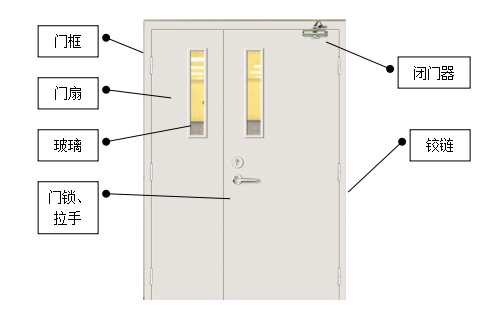 防火門是指在一定時間內(nèi),連同框架能滿足耐火穩(wěn)定性、完整性和隔熱性要求的門。防火門的主要部件包括門扇、門框、玻璃、門鎖、拉手、鉸鏈和閉門器等。